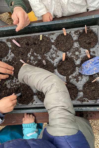 Nichée au coeur d'une micro-ferme, entourée d'arbres, de légumes et de petits animaux, les enfants évoluent dans un lieu unique où la nature est au centre.